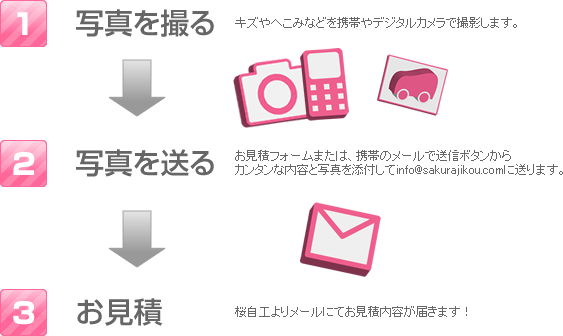 ケータイやデジカメで撮影した写真をメールに添付して送信するだけでお見積をカンタンに取る事ができます。